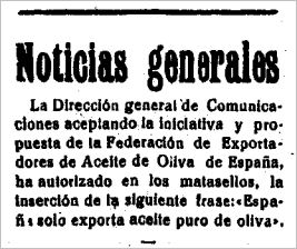 NOTA: La Orden de 18 de diciembre de 1928 prorroga la autorización y substituye la leyenda por otra que reza: EL ACEITE DE OLIVA QUE EXPORTA ESPAÑA ES PERFECTAMENTE PURO. |