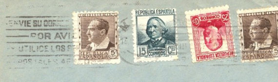 ADMINISTRACIONES PRINCIPALES Y CENTRALES ENVÍE SU CORRESPONDENCIA · POR AVIÓN · Y UTILICE LOS SERVICIOS · POSTALES AÉREOS Solicitante: Líneas Aéreas Postales Españolas Inicialmente, la solicitud se hizo para el lema TRANSPORTADO POR AVIÓN y así se autorizó el 12 de marzo de 1934, con vigencia de un año a partir de su publicación en el Diario Oficial de Comunicaciones del día 27 del mismo mes. Afectaba a Madrid, Sevilla, Las Palmas y, "en su día", Barcelona. Posteriormente, Líneas Aéreas tramita una nueva petición, asumiendo un error en la solicitud inicial, por cuanto el lema deseado es ENVÍE SU CORRESPONDENCIA POR AVIÓN. UTILICE LOS SERVICIOS POSTALES AÉREOS. La Dirección General accede a la modificación, señalando que "esta modificación no implica una autorización nueva a favor del concesionario, a los efectos de plazo concedido para el uso del anuncio". Finalmente se concede una prórroga de un año, ampliando su aplicación a Valencia, Palma de Mallorca y Santa Cruz de Tenerife. La autorización se prorrogó hasta el 20 de febrero de 1936. BARCELONA