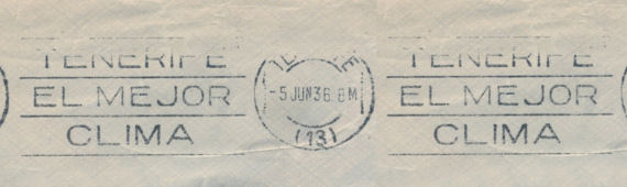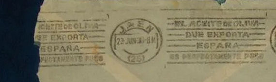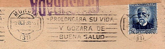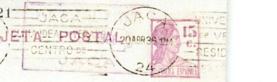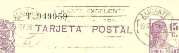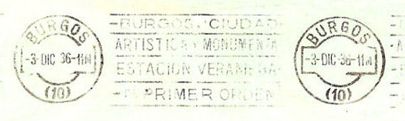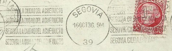 NOTA: Aunque la autorización era para el lema "Galicia paraíso del turista. - Santiago de Compostela ciudad artística y monumental.- 1937 año Santo en Santiago de Compostela.- Santiago de Compostela ciudad de Turismo", el único rodillo que conocemos reproduce solo la mitad. La primera parte del texto, previsiblemente, no se llegó a emplear. |