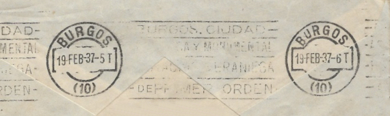 NOTA: Aunque la autorización era para el lema "Galicia paraíso del turista. - Santiago de Compostela ciudad artística y monumental.- 1937 año Santo en Santiago de Compostela.- Santiago de Compostela ciudad de Turismo", el único rodillo que conocemos reproduce solo la mitad. La primera parte del texto, previsiblemente, no se llegó a emplear. |