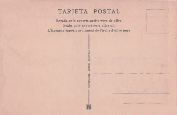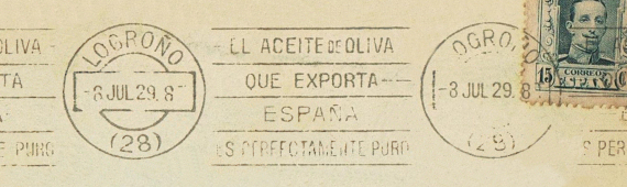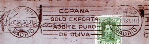 PROMOCIÓN DEL ACEITE DE OLIVA Los rodillos postales, desde un principio, se revelaron como instrumentos propagandísticos de primer nivel. El uso masivo de la correspondencia permitía incorporar mensajes que llegaban a todos los confines y, así, proliferaron los anuncios relativos a monumentos y fiestas, personajes, atractivos turísticos y alimentos diversos que interesaba promocionar. El aceite de oliva fue uno de esos productos que ocupó, con enorme profusión, las cartelas de los rodillos autorizados por la Dirección General de Comunicaciones. El primero, a solicitud de la Federación de Exportadores de Aceite de Oliva de España, se incluyó en la Resolución de 7 de diciembre de 1927, "para todas las Administraciones principales y centrales". El lema autorizado decía: ESPAÑA · SÓLO EXPORTA · ACEITE PURO · DE OLIVA