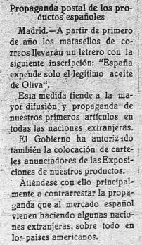 La prensa se hizo eco de la noticia, aunque no siempre de manera acertada, como en el caso de El Noticiero Gaditano, del 23 de diciembre, que da cuenta de la inscripción "España expende solo el legítimo aceite de Oliva". O, rizando el rizo, la aportación del Diario de la Marina, de La Habana, con el lema "España sólo exporta aceite de excelente calidad por sus fronteras y puertos para el extranjero".