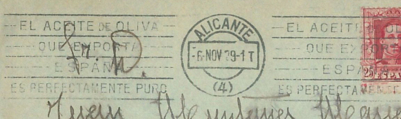 El Luchador, en su edición de 3 de enero de 1930, da cuenta de la reunión de la Comisión Permente del Ayuntamiento, en la que "se leyó un oficio de la Dirección General de Comunicaciones, por el que se prorroga, por un mes más, el empleo del «Matasellos» de propaganda de Alicante". La autorización fue prorrogada, sucesivamente, hasta el 31 de diciembre de 1930, aunque conocemos el uso del rodillo hasta 1937. Vigencia: 7.DIC.1927 / 21.DIC.1930 Uso no autorizado: 1.AGO.1931 / 1.JUL.1941 |