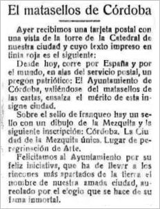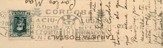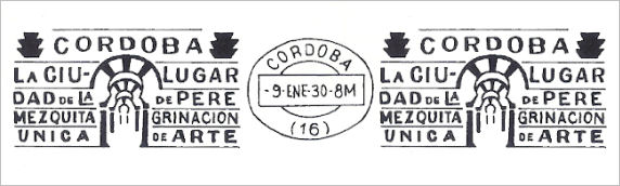 CÓRDOBA · LA CIUDAD DE LA MEZQUITA ÚNICA · LUGAR DE PEREGRINACIÓN · DE ARTE Solicitante: Ayuntamiento de Córdoba El matasellos debió comenzar a emplearse a mediados de marzo de 1928, a tenor de lo que publica el Diario de Córdoba, el día 15. El Ayuntamiento confeccionó unas tarjetas postales con imágenes de la Mezquita, un texto alusivo y el matasellos autorizado.