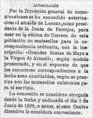 LUCENA (CÓRDOBA) GRANDES FIESTAS DE MAYO A LA VIRGEN DE ARACELI Solicitante: Junta de Festejos de Lucena El Defensor de Córdoba da cuenta de la noticia en su edición de 5 de abril de 1926. Como se desprende de la noticia, se trata de un matasellos y no de un rodillo.