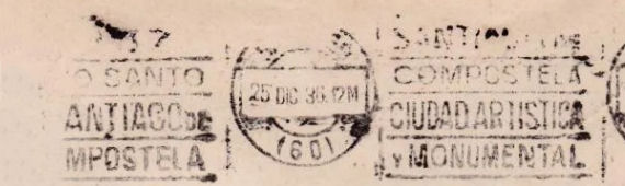SANTIAGO (LA CORUÑA) SANTIAGO DE · COMPOSTELA · CIUDAD ARTÍSTICA · Y MONUMENTAL Solicitante: Gremio de hoteles y similares de la Federación Patronal de Santiago Aunque la autorización era para el lema "Galicia paraíso del turista. - Santiago de Compostela ciudad artística y monumental.- 1937 año Santo en Santiago de Compostela.- Santiago de Compostela ciudad de Turismo", el único rodillo que conocemos reproduce solo la mitad. La primera parte del texto, previsiblemente, no se llegó a emplear. La autorización inicial se prorrogó hasta 1937.