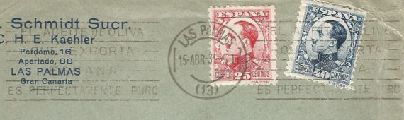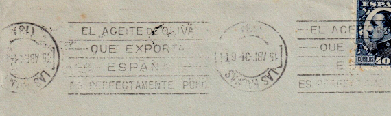 ENVÍE SU CORRESPONDENCIA · POR AVIÓN · Y UTILICE LOS SERVICIOS · POSTALES AÉREOS Solicitante: Líneas Aéreas Postales Españolas Inicialmente, la solicitud se hizo para el lema TRANSPORTADO POR AVIÓN y así se autorizó el 12 de marzo de 1934, con vigencia de un año a partir de su publicación en el Diario Oficial de Comunicaciones del día 27 del mismo mes. Afectaba a Madrid, Sevilla, Las Palmas y, "en su día", Barcelona. Posteriormente, Líneas Aéreas tramita una nueva petición, asumiendo un error en la solicitud inicial, por cuanto el lema deseado es ENVÍE SU CORRESPONDENCIA POR AVIÓN. UTILICE LOS SERVICIOS POSTALES AÉREOS. La Dirección General accede a la modificación, señalando que "esta modificación no implica una autorización nueva a favor del concesionario, a los efectos de plazo concedido para el uso del anuncio". Finalmente se concede una prórroga de un año, ampliando su aplicación a Valencia, Palma de Mallorca y Santa Cruz de Tenerife. La autorización se prorrogó hasta el 20 de febrero de 1936.