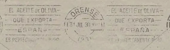 ORENSE EL ACEITE DE OLIVA · QUE EXPORTA · ESPAÑA · ES PERFECTAMENTE PURO La Orden de 18 de diciembre de 1928 prorroga la autorización y substituye la leyenda anterior.