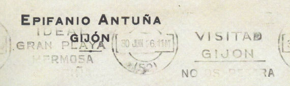 Solicitante: Unión de Gremios del Comercio y de la Industria de Gijón La expresión VENID A, presente en la autorización, cambia a VISITAD, al confeccionarse el anuncio. La autorización, que caducaba el 31 de julio, fue prorrogada hasta el 31 de agosto porque "la referida entidad no pudo hacer uso de la misma debido a considerable retraso en el envío de los rodillos timbres y a ser las inscripciones muy defectuosas". En diciembre se autoriza un anuncio similar. Vigencia: 3.FEB.1925 / 31.AGO.1925 |