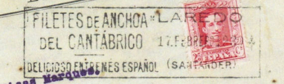 LAREDO (SANTANDER) FILETES DE ANCHOA · DEL CANTÁBRICO · DELICIOSO ENTREMÉS ESPAÑOL Solicitante: Federación de fabricantes de conservas del Cantábrico Según el Boletín de la Federación de Fabricantes de Conservas del litoral Cantábrico, "Se ha conseguido de la Dirección general de Comunicaciones que conceda a ocho puertos del Cantábrico el derecho a una inscripción en los matasellos de Correos encomiando el sabor de la anchoa del Cantábrico. Esta concesión no ha sido utilizada por un retraso de la casa encargada de la confección de los sellos; pero precisamenle han sido consultados los puertos interesados, pues el coste de cada uno de los sellos de referencia resulta elevado para que la Federación se encargue de sufragarlos". Se trata de un matasellos. Los puertos eran Motrico, Guetaria, Ondarroa, Bermeo, Laredo, Santoña, Llanes y San Juan de la Arena y, previsiblemente, salvo Laredo, no llegaron a encargar los matasellos.