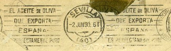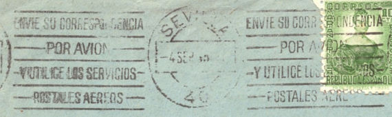 ENVÍE SU CORRESPONDENCIA · POR AVIÓN · Y UTILICE LOS SERVICIOS · POSTALES AÉREOS Solicitante: Líneas Aéreas Postales Españolas Inicialmente, la solicitud se hizo para el lema TRANSPORTADO POR AVIÓN y así se autorizó el 12 de marzo de 1934, con vigencia de un año a partir de su publicación en el Diario Oficial de Comunicaciones del día 27 del mismo mes. Afectaba a Madrid, Sevilla, Las Palmas y, "en su día", Barcelona. Posteriormente, Líneas Aéreas tramita una nueva petición, asumiendo un error en la solicitud inicial, por cuanto el lema deseado es ENVÍE SU CORRESPONDENCIA POR AVIÓN. UTILICE LOS SERVICIOS POSTALES AÉREOS. La Dirección General accede a la modificación, señalando que "esta modificación no implica una autorización nueva a favor del concesionario, a los efectos de plazo concedido para el uso del anuncio". Finalmente se concede una prórroga de un año, ampliando su aplicación a Valencia, Palma de Mallorca y Santa Cruz de Tenerife. La autorización se prorrogó hasta el 20 de febrero de 1936.