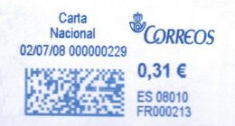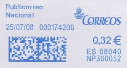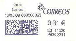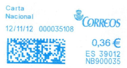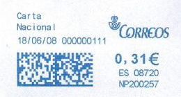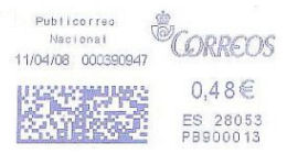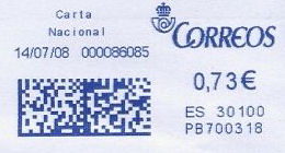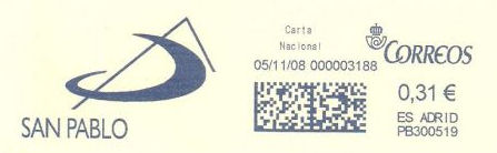 La aparición de improntas azules provenientes de máquinas franqueadoras es sumamente reciente en el correo español. La fecha más temprana que hemos constatado es del 09/01/2008.
