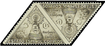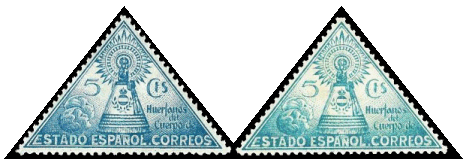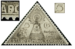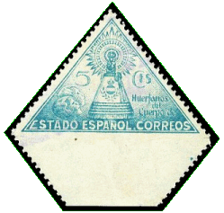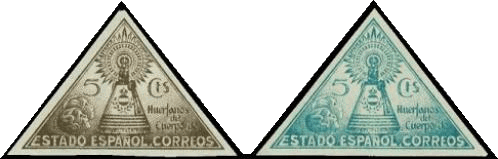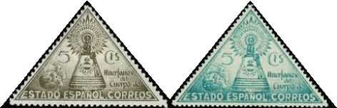 Las penurias provocadas por la Guerra Civil llevaron a la emisión de una buena cantidad de sellos benéficos. De entre los destinados a los huérfanos del cuerpo de Correos dos fueron triangulares: en color castaño, uno, y azul celeste, el otro. Exhiben el mismo valor de 5 céntimos y el diseño, idéntico, muestra la Virgen del Pilar. Se imprimieron mediante litografía y se dentaron a 11 ½ de línea.