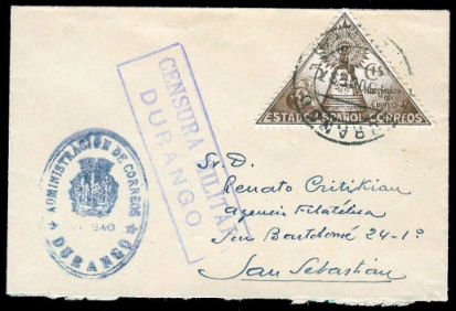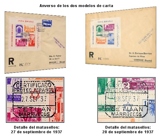 Este sobre muestra, en el matasellos, la fecha 25-OCT-1937 que, teniendo en cuenta que la emisión oficial se produjo, según los catálogos Gálvez y Edifil, en 1938, invita a pensar en un error a la hora de cancelar el envío, aunque no se pueden descartar otras hipótesis como el uso anticipado por falta de sellos postales, un montaje filatélico de época para producir una pieza "imposible" o, lo que sería más significativo, un descuido de los catálogos mencionados.
