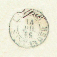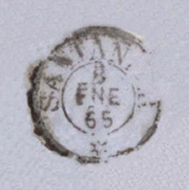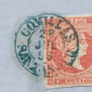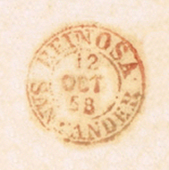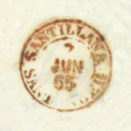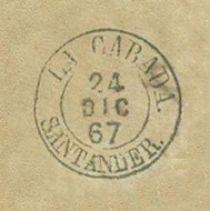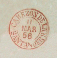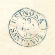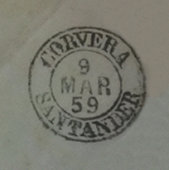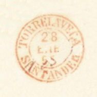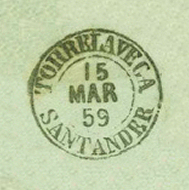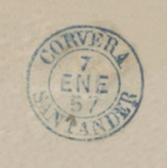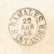 Las Subalternas de la provincia de Santander (Cabezón de la Sal, Comillas, Corvera, Laredo, Ramales, Reinosa, Santander, Santillana y Torrelavega) dependían de la Administración Principal de Burgos. La Cavada, aún no constando como Subalterna en la ordenación final, dispuso de un fechador que guarda semejanza con el de 1854, pero lleva puntos tras las leyendas y SANTANDER aparece mucho más compacto. Muy probablemente es de iniciativa particular. |