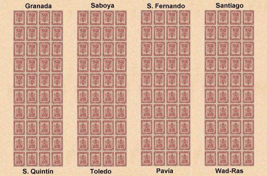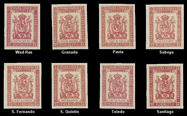 Serie dedicada a diversos Regimientos de Infantería (Santiago, Granada, Pavía, Saboya, San Fernando, San Quintín y Toledo), con el añadido de Cazadores de Santiago, de Caballería, Se encuentran ejemplares en colores rosa carmín, carmín o carmín rojo. |