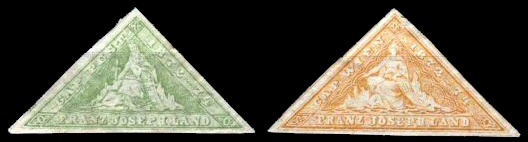 Conjunto de dos viñetas creadas por el comerciante filatélico S. Friedl, de Viena, para homenajear a la expedición polar austro-húngara que el 30 de agosto de 1873 descubrió un conjunto de islas, al norte de Rusia, a las que bautizaron con el nombre del emperador austríaco. Fueron diseñadas siguiendo el estilo de los sellos triangulares de Cabo de Buena Esperanza. Una de ellas, de color verde, reza en su margen izquierdo CAP PEST. La otra, naranja, CAP WIEN. En el lateral derecho ambas muestran la inscripción 1872-74, la duración del viaje. |