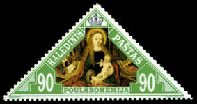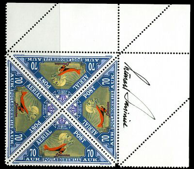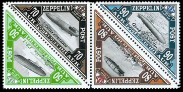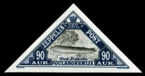 Las viñetas, pretendidamente para uso de correo local de Poulsbohemija Post, fueron impresas en papel ecológico, sin engomar, y perforadas manualmente con una antigua taladradora Rosback. FILOP era una organización lituana integrada por artistas, filatelistas y diseñadores contrarios a la ocupación soviética. FILOP USA, denominación que aparece a la derecha del pie de imprenta, se identifica con aquellos luchadores y les rinde homenaje. La viñeta de 50 Auk. muestra el primer dirigible alemán, el Luftschiff Zeppelin One ( LZ-1), que fue diseñado por Ferdinand von Zeppelin en 1900. El 2 de julio de 1900 sobrevoló, durante 18 minutos, el lago Constance debiendo realizar un aterrizaje de emergencia sobre el agua. La de 70 Auk. nos enseña el dirigible Deutschland. El 22 de junio de 1910 voló de Friedrichshafen a Dusseldorf (Alemania) en el viaje inuagural de la primera línea comercial regular del mundo. La de 80 Auk. representa otro vuelo famoso, el del Norge sobre el ártico. Admundsen, el famoso explorador, consiguió del gobierno italiano la cesión de un dirigible. Partió de Spitsbergen el 11 de mayo de 1926 con el propio Amundsen, Lincoln Ellsworth y Umberto Nobile, piloto italiano autor de los planos del dirigible. Un día más tarde dejaron caer, sobre el Polo Norte, las banderas noruega, estadounidense e italiana. El 14 de mayo, después de recorrer 5457 kilómetros en 72 horas, descendieron en el poblado de Teller, Alaska, convirtiéndose así en los primeros en viajar por aire de Europa a América del Norte. La de 90 Auk. está dedicada al Graf Zeppelin (LZ 127), dirigible alemán que el 29 de agosto de 1929 completó, a los mandos de Hugo Eckener, el primer vuelo alrededor del mundo, volando hacia el este. Tenía una longitud total de 236.6 m y un volumen de 105.000 m³, lo que lo conviertieron en el dirigible más grande de la historia. Se amplió el alcance de la fantasía con emisiones sin dentar y de centro invertido.