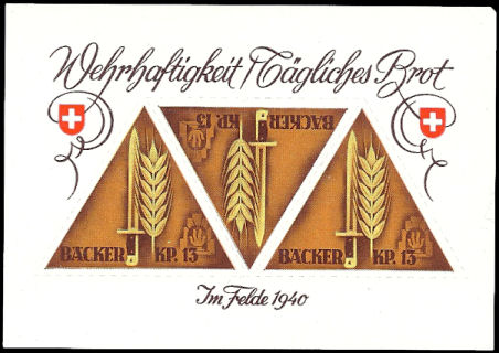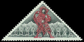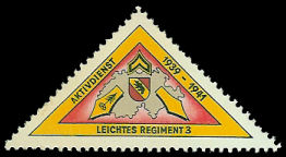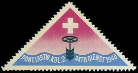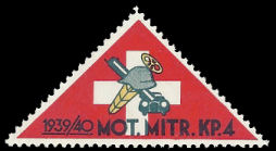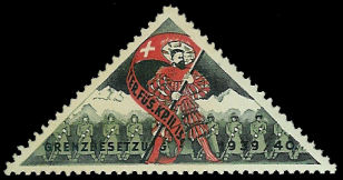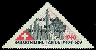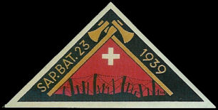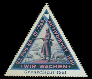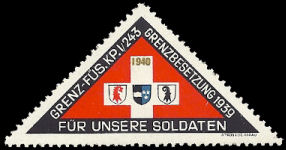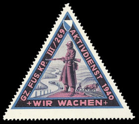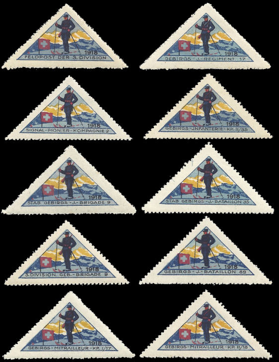 Durante las dos guerras mundiales, especialmente en la segunda, los soldados suizos colocaban en sus cartas las estampillas de su unidad no como franqueo, pues el servicio era gratuito, sino como un identificador que hacía que, al no haber necesidad de cancelarlas, se agilizara el trabajo de los empleados del correo. El importe de las ventas se destinaba a socorrer a las familias de los soldados. Entre las aproximadamente 2.300 etiquetas emitidas, 52 son triangulares, encontrándose dentadas y sin dentar. La clasificación utilizada en esta página sigue el Catálogo de Heinrich Sulser, Die Soldatenmarken der Schweiz 1914/18, 1938/45, publicado en 1990. |